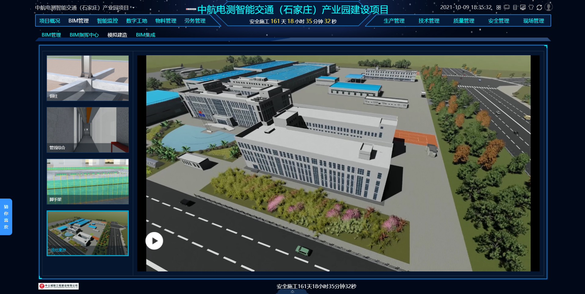 中航电测智能交通(石家庄)产业园项目建设内容主要包括综合办公楼、科研实验楼、培训中心楼、生产厂房、实验场地、产业融合示范区及必要配套设施等。项目建成后将以“智能化、信息化、互联网+”为专业方向,发展高端智能化装配和信息化业务,将有效带动当地就业,拉动经济增长。项目前期BIM团队对该项目进行了建造全过程模拟,提前确定施工部署及验证其实施的可行性,最大限度将进度、质量、安全及成本控制在可控范围内,有效规避风险,进一步提高服务质量和项目品质,并搭建数字化协同平台,通过平台打造智慧工地大脑,将项目管理数据的信息实施多端同步,高效实现建筑施工信息化、智能化、可视化,有效提高总承包管理能力。