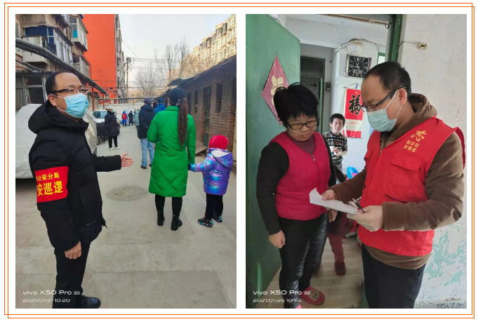张春辉所在社区因规模较小,无物业管理,没有保安,为积极贯彻落实防疫措施,张春辉于1月7日加入了巡逻执勤小组,轮流在社区门口执勤。值守并不简单,需要对出入社区的人员进行登记、询问查询,对无证人员不得放行。对于少部分重视不够的居民,张春辉不厌其烦的宣传相关规定、防控措施,直到居民最终积极配合。