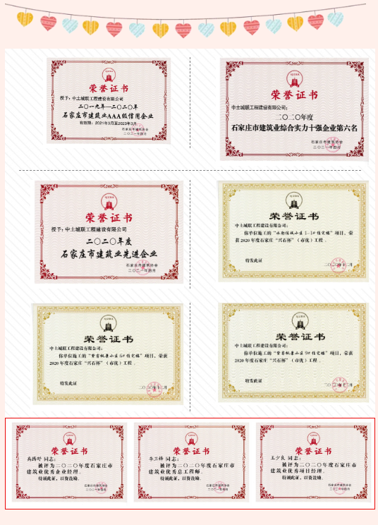 2020年度石家庄市建筑业先进企业 2020年度石家庄市建筑业综合实力十强 2019年-2020年石家庄市建筑业AAA级信用企业 “兴石杯”市优工程 优秀企业经理 优秀总工程师 优秀项目经理等多项殊荣