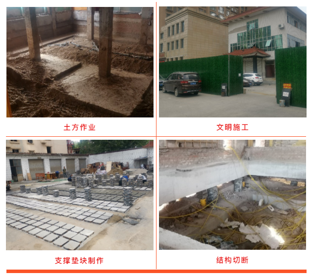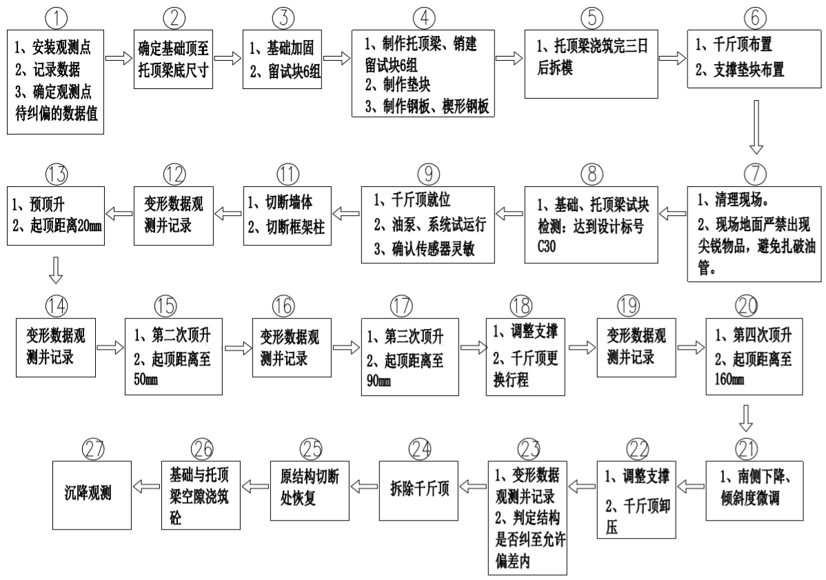 一类是顶升纠倾----把倾斜的低点抬上去。顶升纠倾方法相对复杂,主要采用结构托换体系,利用顶升设备将整个建筑物整体抬起来纠倾,工艺复杂,成本较高。一般情况下在不具备迫降纠倾条件时可用该方法纠倾。因工程施工难度大、工期紧、技术要求严格,在我司全面、深入掌控各类顶升工艺的基础上,针对本工程选派了经验丰富的管理团队。进场前期对设计图纸进行反复甄别、研讨,并对原结构进行建模验算,编制出详细的顶升纠倾专项方案。施工前对工人进行详细的技术交底,并对参与关键节点的班组长、工人进行班前培训、讲解。
