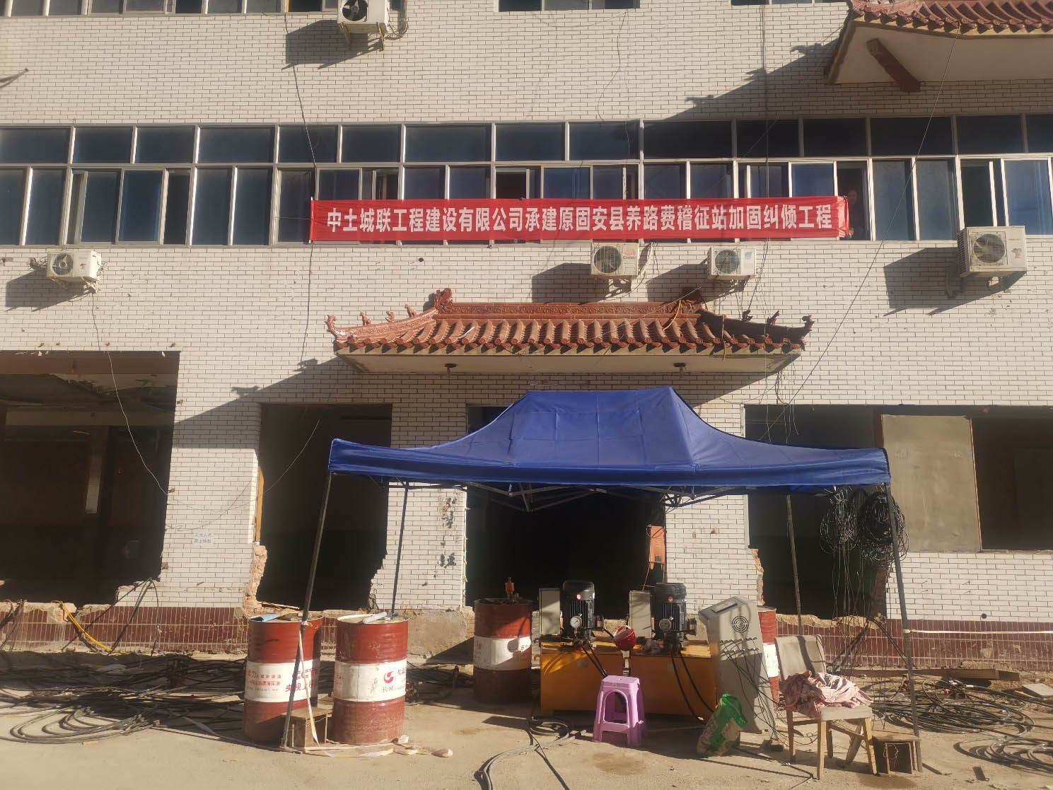 位于廊坊市固安县的养路费稽征站,这里海陆空等交通发达,地理位置十分优越。然而因附近楼体施工期间地基处理不当,导致养路费稽征站办公楼基础受力不均匀而出现北侧整体下沉,房屋严重倾斜偏移10厘米左右,垂直度已超过规范要求,影响正常使用。因业主急于将楼体再次投入使用,综合考虑后决定使用顶升纠倾的方案,由中土城联工程技术公司进行实施。
