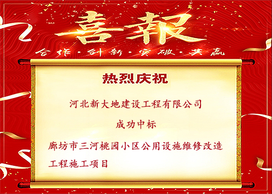 2019年4月22日,河北新大地建设工程有限公司成功中标廊坊市三河桃园小区公用设施维修改造工程施工项目,中标金额:2602329.37元。