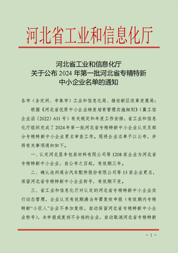 近日,中绎集团荣获河北省工业和信息化厅授予的“河北省专精特新中小企业”荣誉称号。