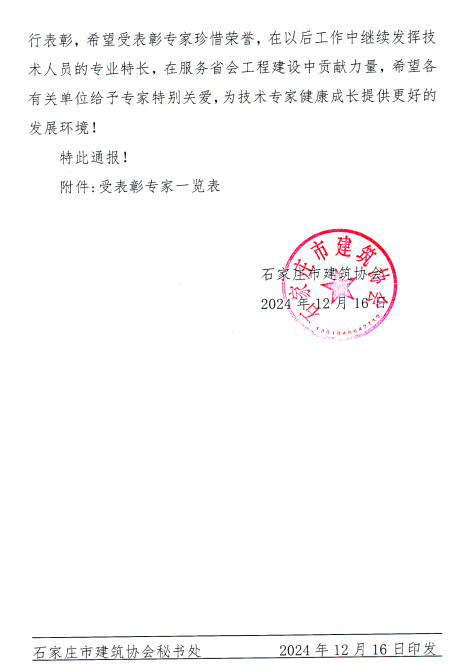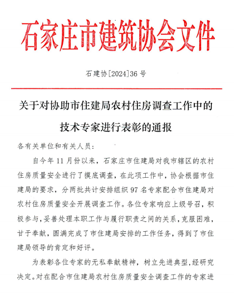2024年11月,石家庄市住建局对市辖区农村住房质量安全进行了摸底调查,中绎集团响应上级号召,派出多位技术专家积极参与,配合市住建局的调查工作,得到石家庄市住房和城乡建设局、石家庄市建筑协会好评,近日受到石家庄市建筑协会表彰。