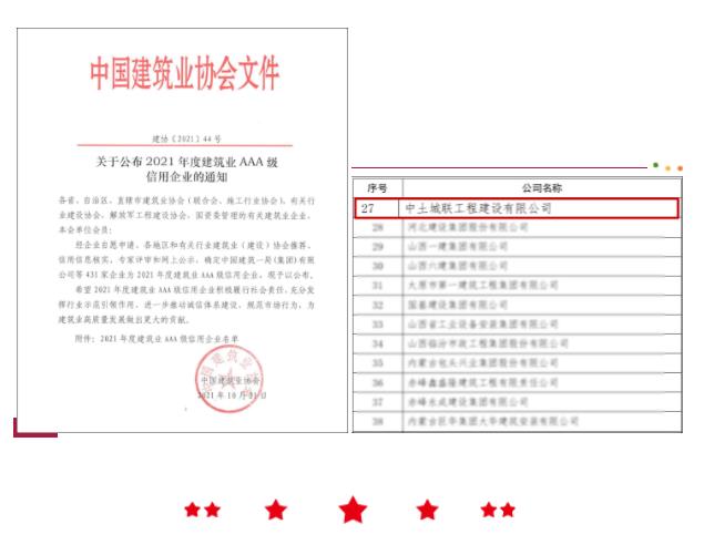 近日,中国建筑业协会官网公布了2021年建筑业AAA级信用企业获评单位,中土城联榜上有名。