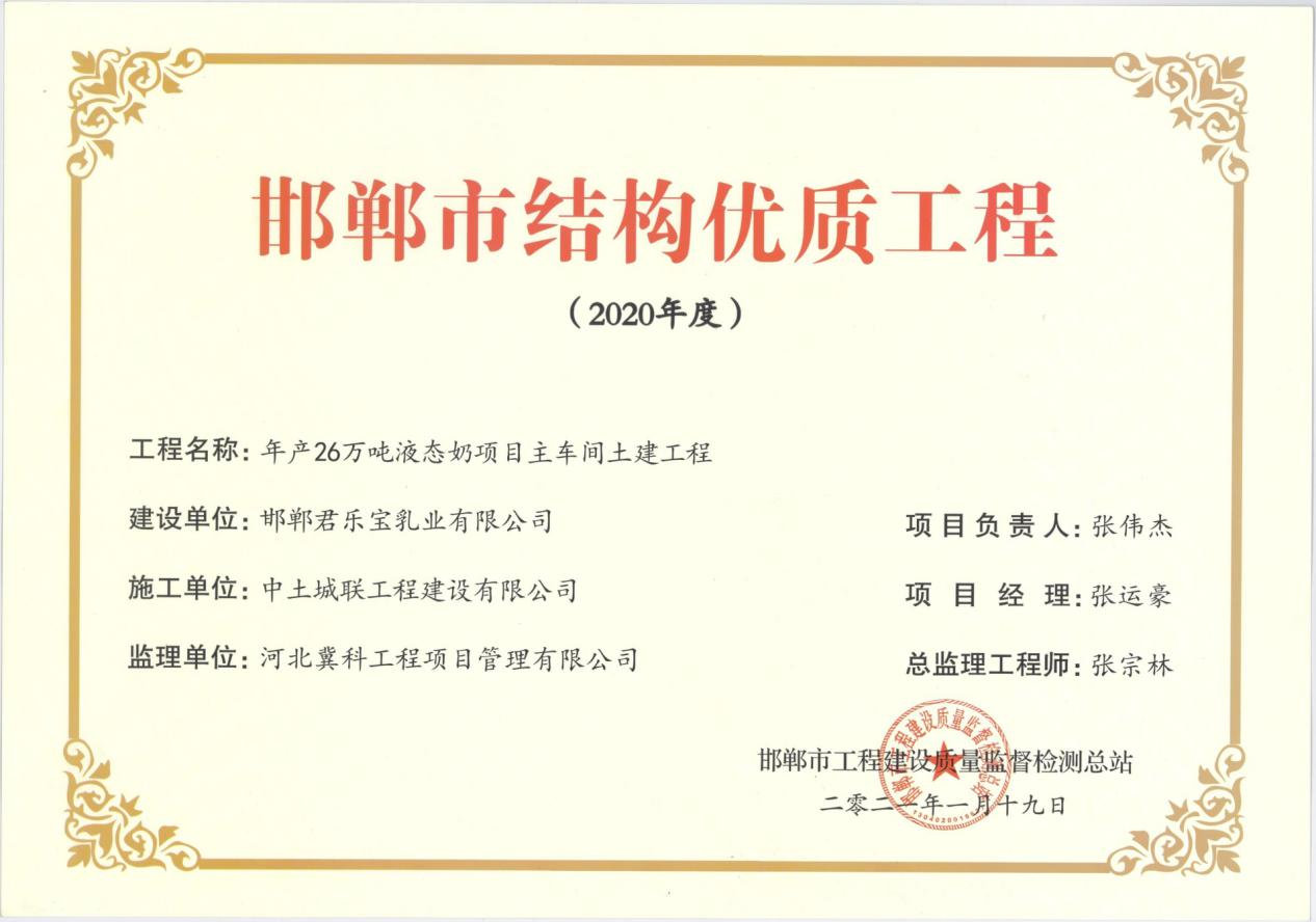 近日,年产26万吨液态奶项目主车间土建工程喜获“邯郸市结构优质工程奖”。项目于2020年4月开工,建筑面积32350.1平方米,结构形式为框架+轻钢结构。